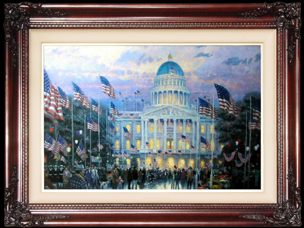 "Flags Over The Capital is my tribute to the American spirit. Nothing brings out American pride more than a celebration with flags flying overhead and banners strung from every window. This is a time when friends, families and neighbors join together in a spectacular display of unity and patriotism."--Thomas Kinkade