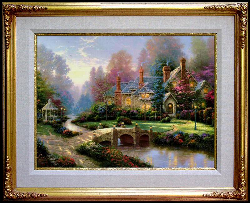 +++++ And this is what Thomas Kinkade said about this work +++++ "Spring, with its perfumed breezes and lavish bouquets of new flowers, is the season of romance. In Spring, the song of new life fills the air and thrills our hearts. Every blooming gate promises to lead us into a paradise where love and peace prevail.In Beyond Spring Gate, the second in my Spring Gate series, I tried to fulfill that promise by leading my collectors to a vernal paradise. Here is an opulent display of flowers and a pristine stream that reminds me of Eden. An ancient Gothic stone bridge urges us on to the regal, yet warm and welcoming manor house. In romantic old England, when walking tours were all the vogue, the poet Wordsworth often stopped to accept the hospitality of a country house. At such a retreat as this, refreshed and inspired, he may have penned the immortal lines of 'Tintern Abbey'.