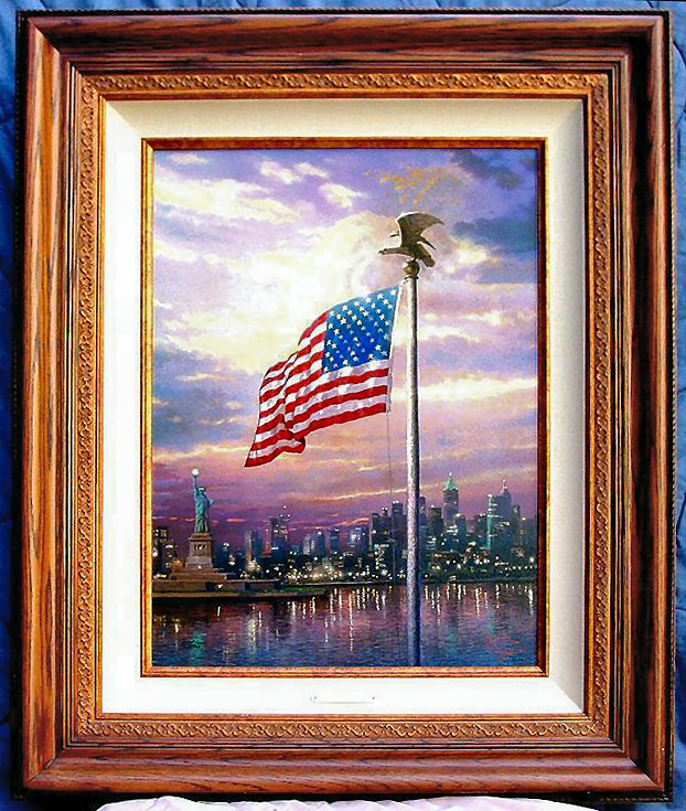 +++++ And this is what Thomas Kinkade said about this work +++++ "For my painting The Light of Freedom, I turned once again to my faith in God, my love for my fellow man, and my pride in America and what we stand for. The billowy clouds in the heavens remind us that despite our challenges, God surely has shed His grace on this land. Now is the time when each of us must summon our courage and strength so that, the Light of Freedom will forever illuminate this glorious country. God bless America."~~ Thomas Kinkade