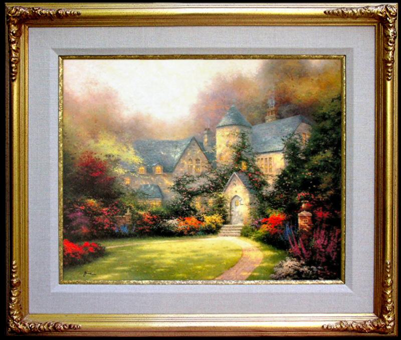 +++++ And this is what Thomas Kinkade said about this work +++++ "Some years ago, in my travels through England, I found a wonderful old stone gate - mysterious, inviting, mysterious, inviting, suggesting all sorts of exciting possibilities. It was only when I was back in my studio, working on the canvas that would become my well known "Autumn Gate". That I realized I didn't know where the gate led. Was it the entrance to a glorious castle or simply a country road leading to some less picturesque setting? When people asked, I wasn't able to answer because I'd never walked in to take a look.This question intrigued me to such a degree that on a later trip, Nanette and I made a pilgrimage back to the setting for the stately, ivy draped stone manor house I celebrate in this painting/ And since this subject lay beyond the gate featured in 'Autumn Gate', I couldn't resist titling it 'Beyond Autumn Gate'.